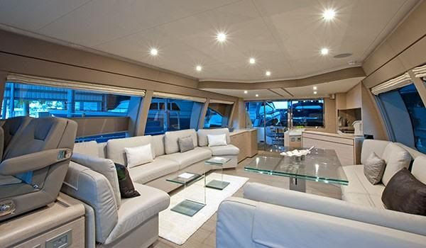 Custom made Frigibar freezer underneath the port sofa next to the helm seat